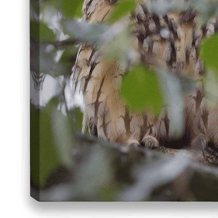 Ransuil kijkt je recht in de ogen vanuit een hoger standpunt in een boom