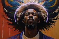 A.I. olieverf schilderij van het portret van een rasta man met de kleuren, oranje/rood,blauw en geel. Boven zijn hoofd een neon kleur, paars en roze halo.