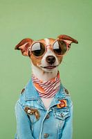 Met een coole zonnebril en een casual spijkerjasje straalt deze Rat Terrier puur stijlbewustzijn uit. Zijn slimme halsdoek en waakzame ogen geven hem een charmante combinatie van nieuwsgierigheid en zelfvertrouwen. Hij poseert tegen een zachtgroene achtergrond en laat zien dat mode en hondenleven perfect kunnen samengaan.