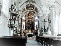 Binnen in de Prachtige Kerk in het Oostenrijkse Rattenberg , kerkbanken beelden, muurschilderingen en bogen.