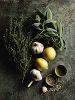 Kruiden, knoflook, citroen en olie zijn geordend als een schilderij. Het werk viert eenvoud en natuurlijke schoonheid, met aandacht voor textuur en balans.
