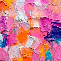 Een abstract kunstwerk met levendige kleuren in een impasto techniek wat een artistiek visueel effect creëert. De kleuren vloeien naadloos in elkaar over en creëren ingewikkelde patronen die het gevoel van zomerse zonsondergangen oproepen.