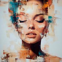 Een kunstwerk van een vrouwengezicht afgebeeld in een abstracte geometrische stijl gevormd door kleine vierkanten van verschillende groottes die verlopen in zachte warme tinten, wat bijdraagt aan de moderne uitstraling.