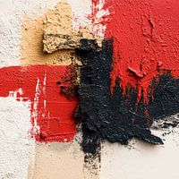 Een abstract schilderij met dikke impasto achtige penseelstreken die bestaan uit dominante kleuren. De algehele indruk is er een van rauwe energie gecreëerd door de dikke verflagen en de sterke kleurcontrasten.