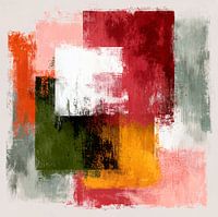 Een abstract schilderij met krachtige, gestructureerde penseelstreken, rechthoekige kleurvlakken overlappen elkaar waardoor een dynamische compositie ontstaat. De algehele indruk is er een van abstract expressionisme met rauwe energie en levendig contrast.