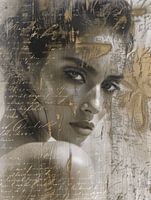 Raw beauty. Mixed media portret in zwartwit met gouden accenten. Kies zelf het formaat en materiaal bij dit werk en maak er een echte blikvanger van voor jouw interieur.