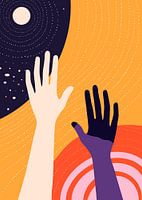 Twee handen steken omhoog boven een kleurrijke achtergrond, in de stijl van kosmische landschappen. De afbeelding kenmerkt zich door gedurfde contouren, vlakke kleuren in donker violet en licht oranje. Dit alles geeft een illustratie die doet denken aan het midden van de eeuw, met heldere composities en subtiele details in de vorm van…