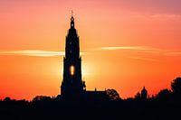 De Cunerakerk gisteravond vlak voor zonsondergang gehuld in oranje. De zon gaat precies achter de toren onder.