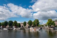 AmsterdamUitzicht van de Westerdok naar de Realeneiland met de aangemeerde boten weerspiegeld in de water.