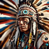 Een man in traditionele Indiaanse kledij staart plechtig opzij. Zijn gezicht is versierd met levendige blauwe en witte verf die de uitgebreide gevederde hoofdtooi die hij draagt aanvult.