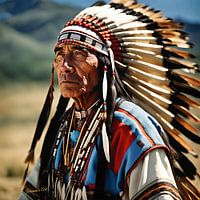 Een oudere Indiaanse persoon is afgebeeld met een plechtige uitdrukking en draagt een traditionele hoofdtooi met lange veren. Ze zijn versierd met kleurrijke kleding, kralenkettingen en de ingewikkelde hoofdtooi duidt op een positie van respect of autoriteit in de gemeenschap.