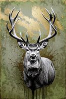 Dit unieke ontwerp toont een indrukwekkend hert met grote, vertakte geweien tegen een achtergrond die kunstzinnig met goud en groen is bewerkt. Het detail in de vacht en de realistische uitstraling van het hert trekken direct de aandacht, terwijl de abstracte accenten een moderne twist geven. Perfect voor in een woonkamer of kantoor waar natuur en elegantie samenkomen. De monochrome details en gouden elementen zorgen voor een stijlvolle uitstraling die harmonie brengt in elk interieur. Ideaal voor wie van realistische kunst met een vleugje abstractie houdt!