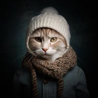 Het portret van een rode kat met wit wollen muts en blauw jasje aan met warme bruine das. De poes is afgebeeld tegen een donkere achtergrond waardoor het portret goed naar voren komt.