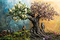 Dit prachtige kunstwerk brengt de natuur tot leven met een schitterend realistisch ontwerp van een boom die de lente en zomer vertegenwoordigt. Met gedetailleerde bloesem, groene bladeren, en omringd door kleurrijke bloemen en dieren zoals een eekhoorn en een uil, ademt het een serene en magische sfeer. Perfect als wanddecoratie voor een slaapkamer of eetkamer, dit ontwerp is een eyecatcher die rust en elegantie toevoegt aan elk interieur. Ideaal voor natuurliefhebbers die een stukje buitenwereld in huis willen halen.