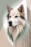 Dit prachtige ontwerp toont een realistische weergave van een majestueuze hond in digitale kunstvorm. Het gedetailleerde, zachte kleurenpalet van beige, wit, en lichtgroen zorgt voor een kalmerende uitstraling die perfect past in een serene woonomgeving. De achtergrond van hout versterkt het natuurlijke gevoel, terwijl de sierlijke…
