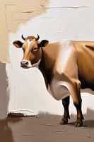 Dit unieke kunstwerk toont een prachtig realistisch portret van een koe, afgebeeld tegen een artistiek abstracte achtergrond. De penseelstreken zijn dik en expressief, wat het geheel een opvallende textuur geeft en de koe zelf in een verfijnde rustieke sfeer plaatst. De aardse tinten van bruin, wit en beige geven een kalm en warm gevoel, waardoor dit stuk perfect past in een rustige woonomgeving. De mix van realistische details met een minimalistische achtergrond maakt dit ontwerp zowel tijdloos als modern. Ideaal voor liefhebbers van dierenkunst en degenen die hun interieur willen verrijken met een verfijnd doch eenvoudig kunstwerk dat een rustgevend gevoel uitstraalt.