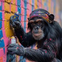Een creatieve aap met een spuitbus verft een kleurrijke muur in een stedelijke omgeving.