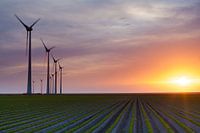 Een windmolenpark in de Eemshaven en kaarsrechte lijnen in het veld. Beide worden verlicht door het laatste zonlicht.