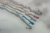 De Red Arrows vliegen in formatie op een donkere dag tijdens de Luchtmachtdagen. De straaljagers laten een spoor na met hierin de kleuren rood, wit en blauw. De donkere wolken geven een goed contrast met de rode vliegtuigen.