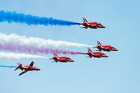 5 Leden van de Red Arrows, het demonstratieteam van de Engelse Royal Air Force, vliegen met rook in formatie tijdens een vliegshow. De Red Arrows gebruiken BAE Hawk T1 straaljagers voor hun show.