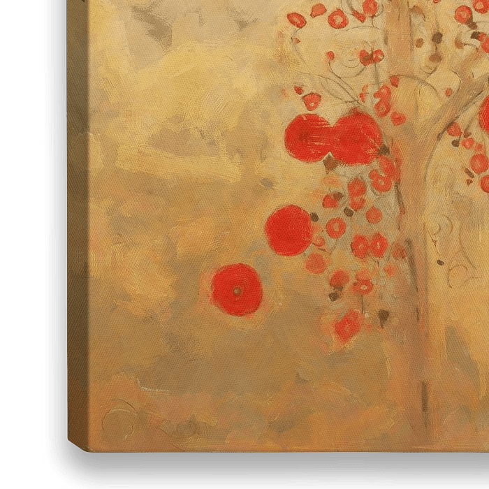 Dit werk toont een boom vol felrode bloemen tegen een lichte, neutrale achtergrond. De levendige rode bloemen contrasteren prachtig met de subtiele tinten van de achtergrond, wat een warm en uitnodigend gevoel geeft. De kronkelende takken en delicate bladeren voegen een speels element toe aan de compositie. Deze afbeelding straalt…
