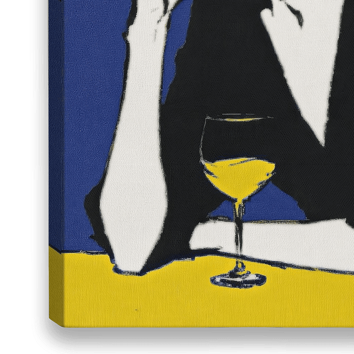 Red Hat - Dit vrouw schilderij toont een elegante vrouw met een rode hoed en een glas met een gouden drank, heerlijk contrasterend tegen de blauwe achtergrond en de gele tafel, wat een sfeervolle en chique ambiance oproept.