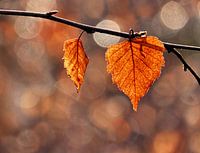 Twee rood-oranje Berkenblaadjes in zonlicht. Een fijn en natuurlijk beeld voorzien van een mooi bokeh in de achtergrond. Alhoewel het lijkt alsof dit beeld in de herfst is gemaakt is dit niet zo. Sommige Berkenbladeren blijven de hele winter hangen en blijven op die manier kleine sieraden in de bossen.