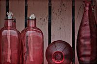Zomaar wat rode flessen bij elkaar in een vitrinekast.