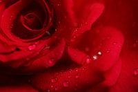 A close-up of a red velvet rose in bloom with droplets on the petals.