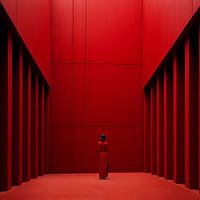 Een figuur in rood verdwijnt in een architectonische ruimte van dezelfde kleur. Een krachtig spel van vorm, kleur en stilte.