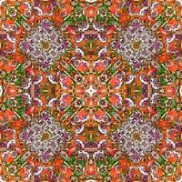 Een foto van pluizige paarse bloemen in een tuin in het najaar vormde de basis voor dit digitale kunstwerk. Door die foto te spiegelen en kopieren en het resultaat in vier transparante lagen over elkaar te plaatsen, ontstond dit beeld.