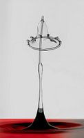 Dit tweeluik is symmetrisch (de bodem is gespiegeld) en kan mooi naast elkaar hangen. Bijna identiek, maar een andere impact van de vallende druppel. Dit is een complexe vorm van fotografie en vergt perfecte timing van 2 druppels die op elkaar botsen...