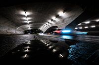 Red car in motion. Foto gemaakt op een regenachtige avond in Arnhem. De regen zorgt voor een mooie en unieke sfeer en mooie weerspiegeling van de lampen in de plassen.