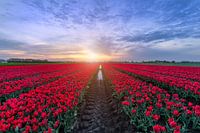 A beautiful sunset between the red tulips in the Netherlands. Spring time in the Netherlands is one of the most amazing seasons to visit.