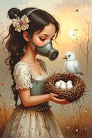Een jong meisje, met een retro jurk aan en een gasmasker op, heeft een vogelnestje in haar handen met eieren er in en een wit vogeltje zit op de rand van het nest. Het meisje probeert op deze manier het leven op aarde te redden. De mens heeft het leven op aarde bijna verwoest. Gelukkig is dit maar een nachtmerrie, we hopen dat het nooit…