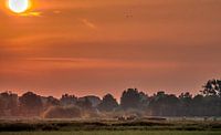 Tijdens het hooien kwam er een hoop stof vrij van de tractoren, die mooi oranje kleurde door de zon.