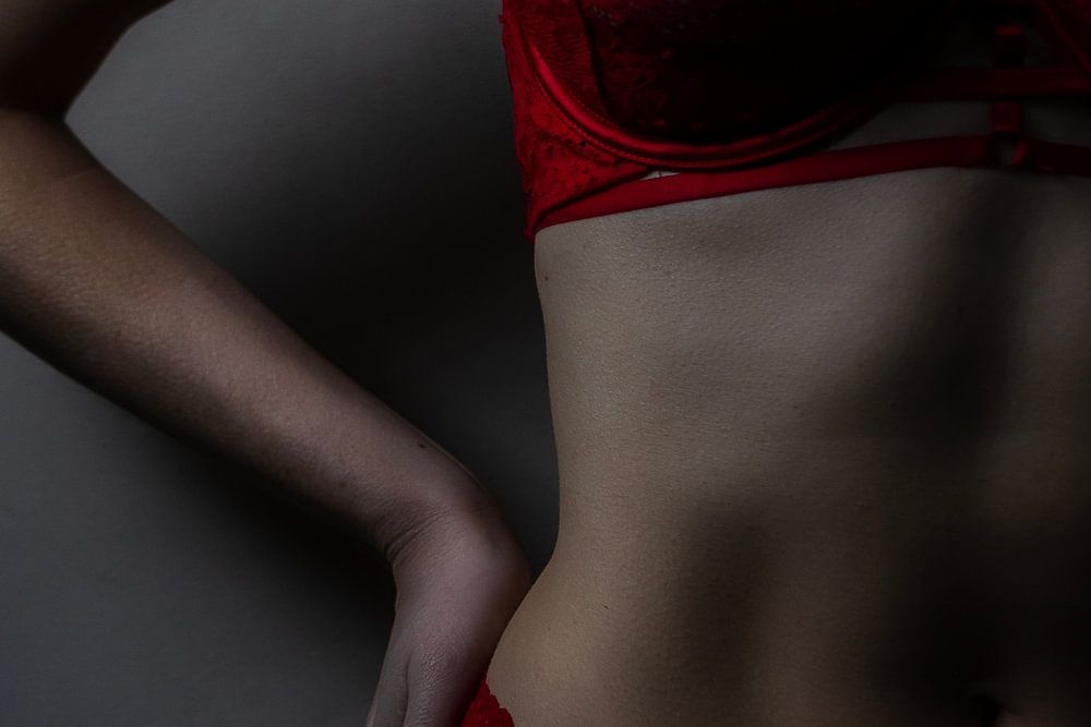 Door de lowkey belichting komt de rode lingerie goed naar voren en springt dit uit de foto. Details zoals het kant en de gouden gespjes zijn duidelijk zichtbaar. Een stijlvol en sensueel beeld, waarin het vrouwelijke lichaam prachtig belicht is.