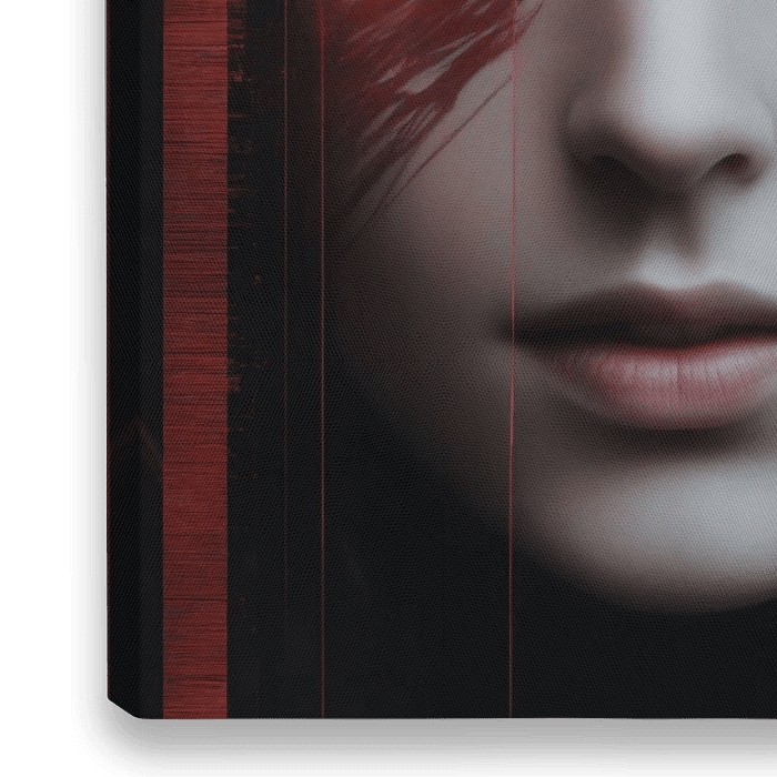 Indrukwekkend A.I. Glitch art portret van een vrouw met rood en blauw als hoofdkleuren.