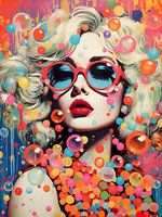 Een kleurrijke Pop art plaat van een blonde dame met een rode zonnebril met blauwe glazen.