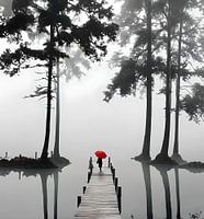 Vrouw met rode paraply op een steiger in de mist