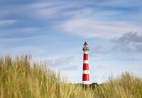Vuurtoren Ameland, rood, wit en blauw met helmgras op de voorgrond