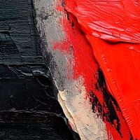 Abstracte compositie met gestructureerde verfstreken in zwart, rood en roomwit. Het zwarte vlak domineert de linkerkant, in contrast met de dikke, levendige rode verf aan de rechterkant, met een grijsverloop en subtiele witaccenten ertussen, wat een dynamisch samenspel van kleuren en texturen creëert.
