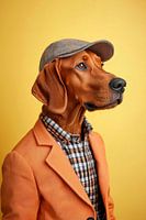 Gekleed in een chique oranje kleur met een modieuze hoed op zijn hoofd, straalt deze Redbone Coonhound karakter en stijl uit. Zijn alerte blik en elegante outfit geven hem een onmiskenbare aanwezigheid, terwijl zijn opvallende roodachtige vacht contrasteert met de zachtgele achtergrond. Een waar meesterwerk van de mix van natuur en…