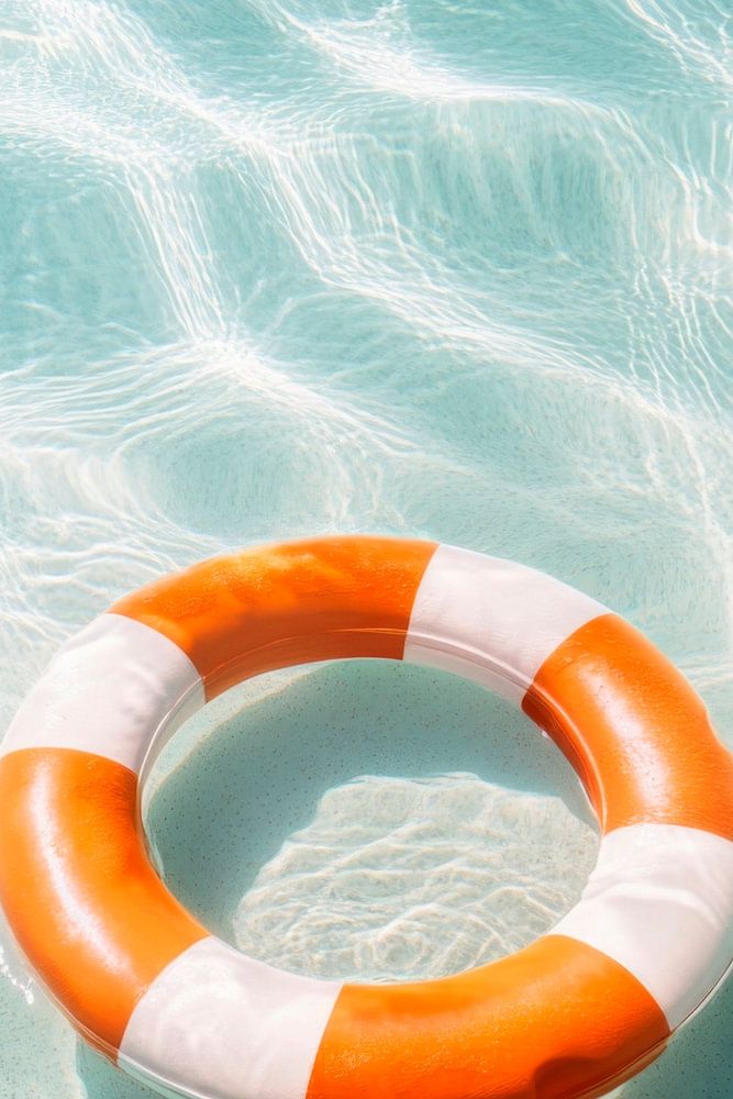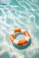 Zachte golven glinsteren in het zonlicht, terwijl de fel oranje en witte reddingsboei kalm op het water drijft. Zijn beschermende aanwezigheid geeft een gevoel van veiligheid, omgeven door een ontspannen, bijna droomachtige sfeer. De glinsterende reflecties dansen speels en nodigen je uit om te ontsnappen aan het alledaagse leven en te genieten van het verfrissende water.