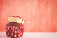 Een zijaanzicht van een enkele redvelvet cupcake met een roomkaas botercrème. Perfect om jezelf of een geliefde te vieren of gewoon om in je keuken te hangen.
