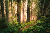 De varens op de voorgrond en de redwoods en de mist maken dit een perfecte plek in het bos.