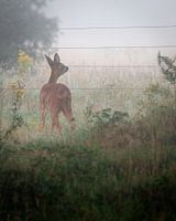 Deze foto is gemaakt op een schitterende ochtend bij Planken Wambuis (Veluwe). Het ree had niet door dat ik er was en bewoog zich rustig langs een afgezet stuk waar normaliter runderen grazen. Door de mist, de stilte en mijn camouflage had ze niet door dat ik haar vastlegde.