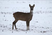 Ree in de sneeuw op een akker in de omgeving van Wijster. Foto gemaakt vanuit een schuiltent. Ik gebruik een jagersslaapzak om mijn benen warm