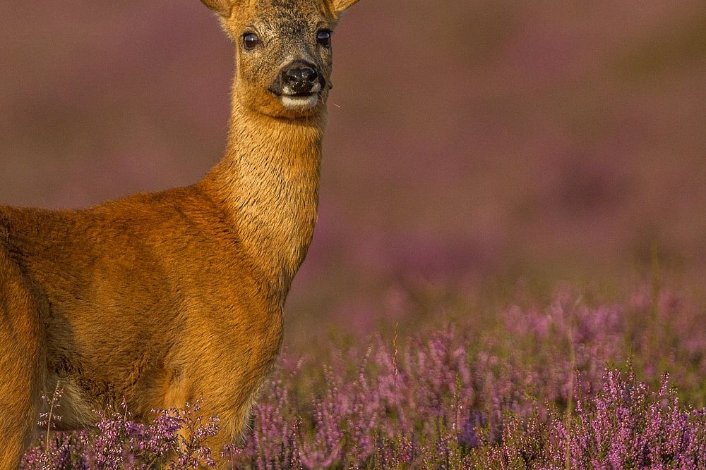 Op een mooie zomeravond in augustus stond deze reebok in de bloeiende heide die op dat moment mooi paars is.