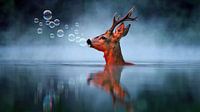 Een reebok, zwemmend in het water, ruikt aan de zeepbellen die boven het water zweven. De late avondzon schijnt op zijn kop en op de achtergrond komt langzaam de waterdamp boven het water zweven waardoor het een sprookjesachtige uitstraling krijgt. Het beeld is met behulp van ai gegenereerd.
